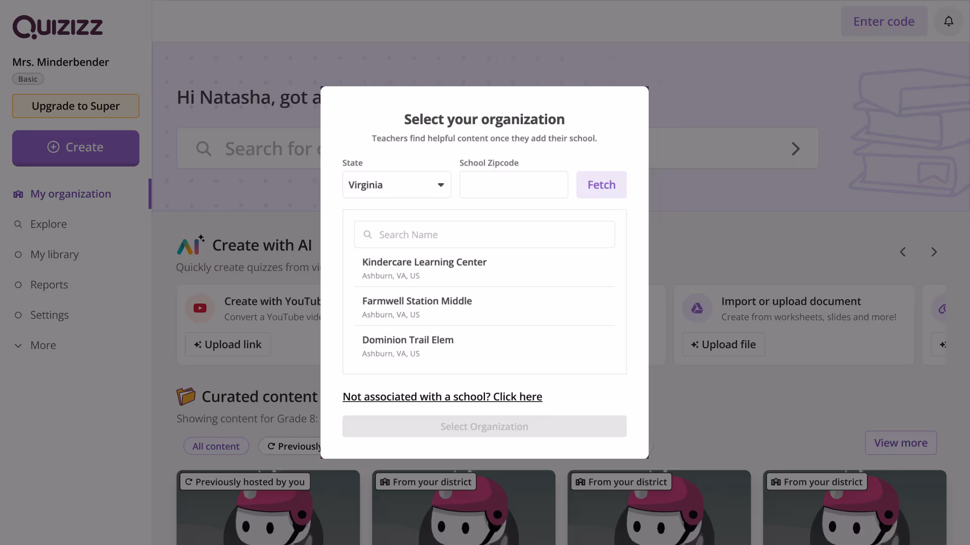 Every teacher has an organisation (school or school district) that they are associated with. As a part of the Quizizz signup process, every teacher has to submit this information.