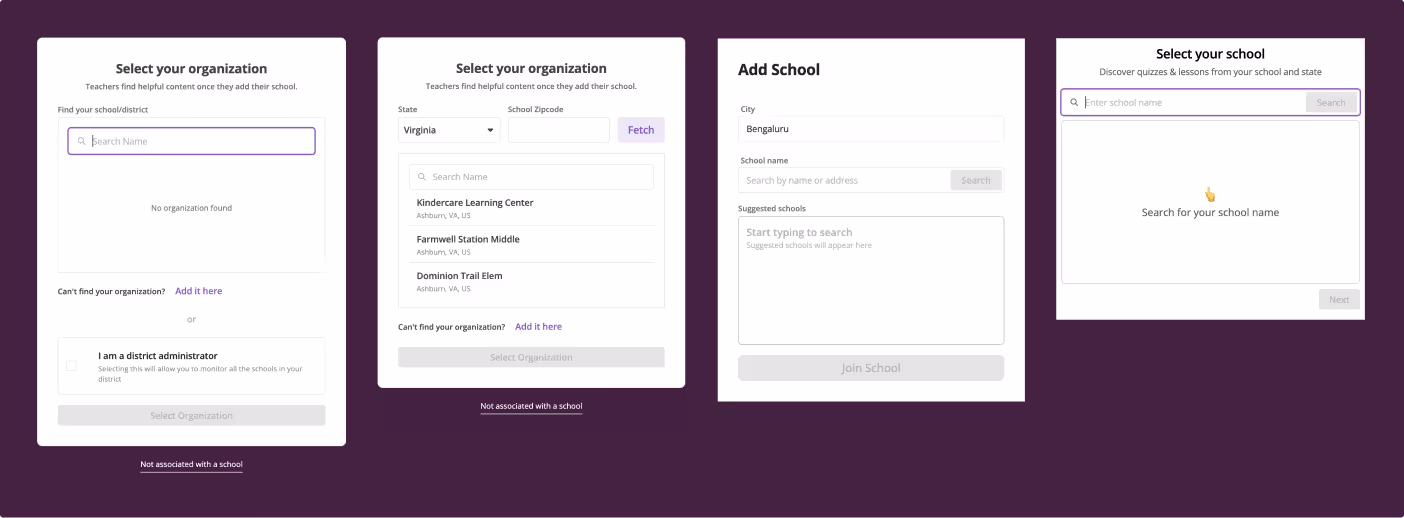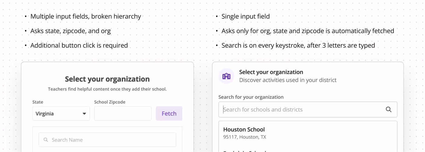 Inaccuracy of org data is a problem that is very prominent in Quizizz. This affects content recommendation accuracy, reduced admin trust, and hassles in lead generation. This project rethinks the org picker for teachers to make it easier for users to find their org, improve accuracy, and reduce dropoffs