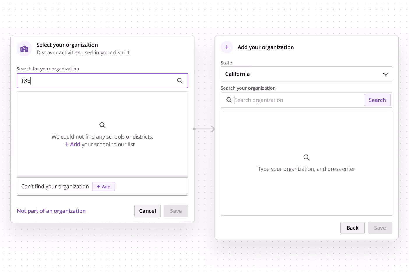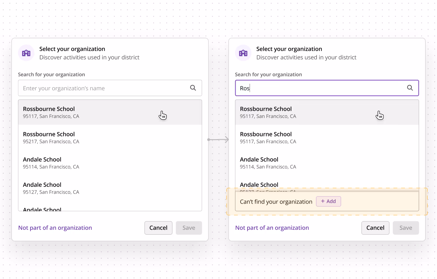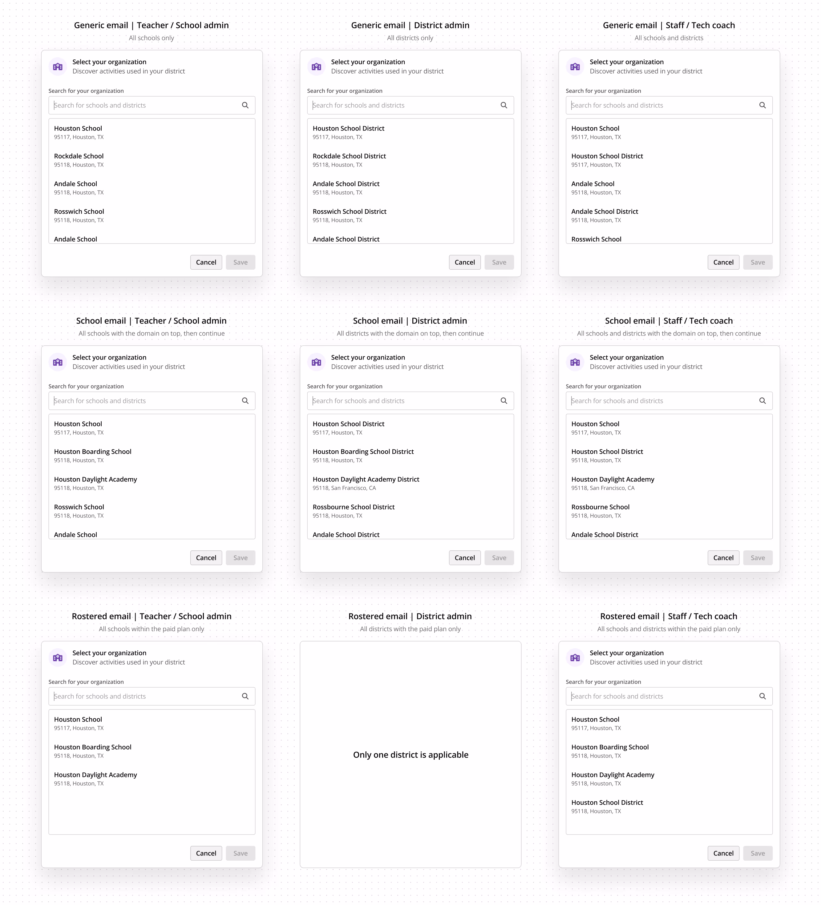 Moreover, if a user has been rostered to a school or a district paid plan, they should only see the relevant org so that the list is more concise.